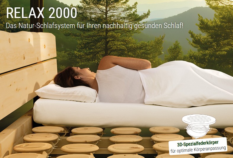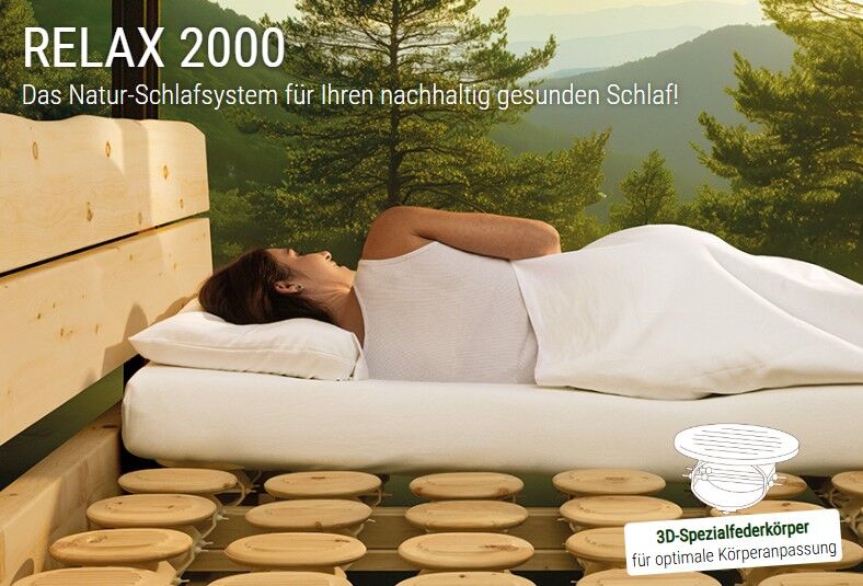 Was ist das Relax 2000 Schlafsystem?Das Relax 2000 ist ein innovatives, metallfreies Schlafsystem aus Holz, das sich optimal an den Körper anpasst. Durch seine flexible 3D-Konstruktion sorgt es für eine punktgenaue Unterstützung und Entlastung – unabhängig von Schlafposition oder Körperbau.